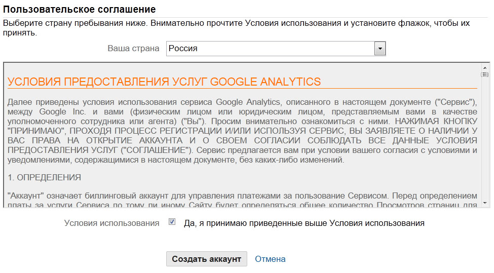 Принять условия "Пользовательского соглашения" поставив галочку рядом с фразой "Да, я принимаю приведенные выше Условия использования" и нажать кнопку "Создать аккаунт"